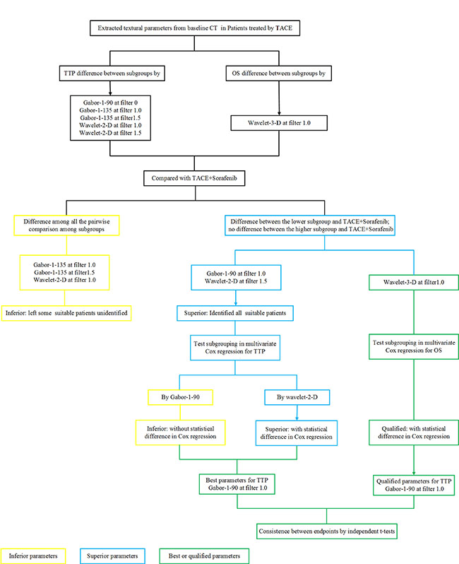 In order to identify such patients appropriately, 3 steps were designed in this study. Firstly, textural parameters conveying prognostic information were identified and patients in the TACE group were divided into lower and higher subgroups according to their thresholds. TTP and OS in the 2 TACE subgroups were compared. Secondly, the TTP and OS of the subgroups were compared to those of the TACE+S group. Multivariate Cox regression analysis was used to test whether the subgrouping represented independent prognostic factors. Thirdly, consistency was confirmed between the parameters of TTP and OS. After those steps, we proved that compared with the combination group, although some patients in the TACE group (e.g. TACE-1 and TACE-5) had similar survival, others (e.g. TACE-2 and TACE-6) indeed showed a shorter survival. Considering the comparability of baseline characteristics between the TACE+sorafenib group vs. the TACE-2 group (Gabor-1-90 > 3.6190) or TACE+sorafenib group vs. the TACE-6 group (wavelet-3-D >12.2620), as well as the consistency of the first and second outcomes, we believed that if TACE-2 or TACE-6 were treated by the combination of TACE and sorafenib, they would probably have a better survival. Thus the cohort had similar textural features with TACE-2 or TACE-6 are the suitable patients for the combination therapy.
