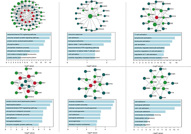 To understand the communication between the IgSF and the breast cancer driver genes, we performed a module analysis in the IDDN. We found six significant IgSF-associated modules in which IgSF and breast cancer driver genes were closely associated (Figure 3). We conducted a GO terms enrichment analysis of the module genes using DAVID [19] and identified the biological process terms that enriched the module genes using a cutoff of FDR < 0.05 (Supplementary Table S5). The top-ranked GO terms included immune response, cell adhesion, biological adhesion, regulation of alpha-beta T cell proliferation, transmembrane receptor protein tyrosine kinase signaling pathway, and T cell activation. The GO term cell adhesion enriched by the second and sixth module genes is a very important biological process of the IgSF genes (VCAM1, ICAM1, F11R, ITGAL, EZR, ICAM4, ICAM5, ICAM2, ICAM3, ITGB5, ITGB2, and CD226) that participate in the immune response. Among these, the expression of members of the ICAM family regulates tumorigenesis and are potential diagnostic biomarkers and therapeutic targets for breast cancer [20]. Moreover, both the first and fourth modules enriched the common GO term phosphate metabolic process, which is differentially regulated in breast cancer [21].