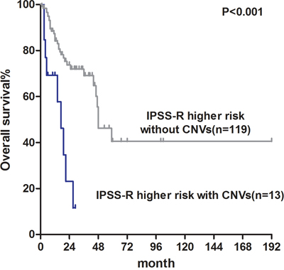 Bone marrow specimens were collected from subjects at diagnosis. Genomic DNA was extracted using the AxyPrep Blood Genomic DNA Miniprep Kit (Axygen Biosciences, cat no. AP-MN-BL-GDNA-250 Union city, CA, USA) and subjected to MLPA analysis using a SALSA MLPA P414-A1 Kit (MRC Holland, Amsterdam, Netherlands) according to the manufacturer’s instructions. The probemix contained 46 probes targeted to chromosomal regions of interest in MDS (Supplementary Table S1) and 12 internal reference probes targeted to regions that are generally unchanged in MDS. Finally, PCR products were analyzed using an ABI 3730 capillary sequencer (Applied Biosystems, Foster City, CA USA) and Coffalyser software (MRC Holland, Amsterdam, Netherlands). To eliminate differences between the probes, a normal range for each MDS targeted probe was established to improve the accuracy of the MLPA analysis. In addition, 20 DNA samples derived from the peripheral blood of healthy donors were subjected to MLPA analysis. The “Mean±2SD” (95% CI, P=0.05) and “Mean±3SD” (95% CI, P=0.01) values for each individual probe are listed in Supplementary Table S1. To improve the evaluation of the results with a larger CI, the “Mean±3SD” reference range was used as the cutoff value for CNV determination in our study.