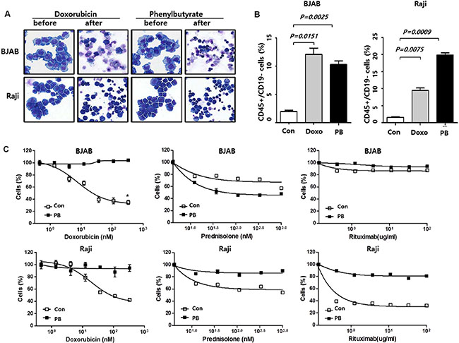 Figure 1: Generation of B-cell lymphoma cells surviving drug treatment. (A) Morphology of BJAB and Raji cells after 48 h incubation with doxorubicin (300 nM) or phenylbutyrate (8 mM): Original magnification, x 400; May–Grünwald–Giemsa staining. (B) Flow cytometry analysis of the CD45+/CD19− cell population and comparison of CD45+/CD19− cell fraction among control cells (con), doxorubicin (Doxo) and phenylbutyrate (PB)-treated surviving cells. (C) Dose-response curves shows higher viability of phenylbutyrate (PB)-treated surviving BJAB and Raji cells than control cells (con) when cells are seeded at a density of 5 × 104 cells per well in 24-well plates, treated with the indicated doses of doxorubicin, prednisolone and rituximab. Data represents means ± SEM of three independent experiments.
