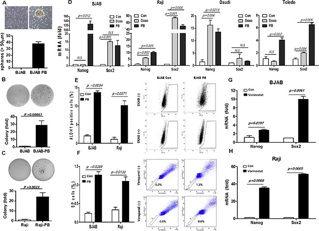 Figure 2: Stem cell-like properties of B-cell lymphoma cells surviving drug treatment. (A) Phenylbutyrate-treated surviving cell (PB) shows tumor sphere formation in BJAB-PB cells compared to BJAB cells. (B, C) Colony formation is increased in BJAB-PB and Raji-PB cells compared to control cells. (D) Stem cell marker mRNA levels (Nanog and Sox-2) are increased in lymphoma cells surviving treatment with doxorubicin (Doxo) or phenylbutyrate (PB) compared to control cells (Con) in BJAB and Raji. Data represent means ± SEM of three independent experiments. (E) BJAB-PB and Raji-PB cells show significantly higher proportion of aldehyde dehydrogenase (ALDH)-positive cells than control cells (Con). (F) BJAB-PB and Raji-PB cells show more increased fraction of side-population than control cells. (G, H) Another histone deacetylase inhibitor, vorinostat-treated surviving cells show higher mRNA level of stem cell markers (Nanog and Sox-2) than control cells.