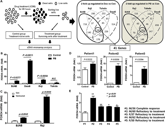 Figure 3: Comparison of gene expression profiles and FOXO4 overexpression. (A) Study scheme of gene expression analyses using doxorubicin (Dox) and phenylbutyrate (PB)-treated surviving cells: Four different cell lines (BJAB, Raji, Toledo, and Daudi) are treated with doxorubicin (300 nM) or phenylbutyrate (8 mM) for 48 h, and cDNA microarray analysis is done to identify differentially expressed target genes between treatment-surviving cells and parental control cells. (B) FOXO4 mRNA level is significantly higher in phenylbutyrate-treated surviving (PB) cells of BJAB, Raji and Daudi than control cells. (C) Vorinostat-treated surviving cells show higher mRNA level of FOXO4 than control (Con) cells of BJAB and Raji. (D) Primary lymphoma cells from three patients with refractory diffuse large B-cell lymphoma (DLBCL) show increased expression of FOXO4 in phenylbutyrate-treated surviving cells (PB) compared to the corresponding control cells. (E) The FOXO4 mRNA level is significantly higher in primary cells from four patients with refractory DLBCL than that of a patient with DLBCL who achieved complete response. Data represent means ± SD from three independent experiments.