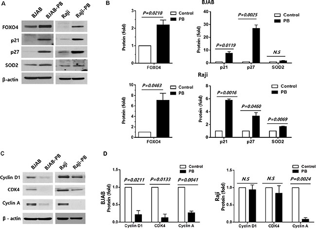 Figure 4: Effect of FOXO4 on the expression of target proteins in phenylbutyrate treated-surviving cells. (A, B) Phenylbutyrate-treated surviving cells (BJAB-PB and Raji-PB) increase the expression of FOXO4 and its transcriptional targets (p21, p27, and SOD) compared to control cells. (C, D) BJAB-PB and Raji-PB cells show decreased expression of cyclin D1, CDK4, and cyclin A compared to control cells.