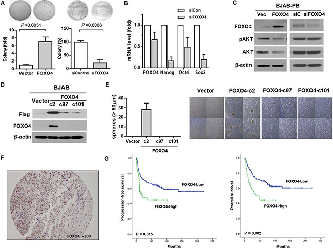 Figure 5: The association of FOXO4 with stem cell properties and prognosis of diffuse large B-cell lymphoma. (A) Soft agar colony formation in FOXO4-transfected or siFOXO4-transfected BJAB cells shows the amplification of FOXO4 increase colony forming ability and the knockdown of FOXO4 decrease colony formation in BJAB cell line. (B) Decrease in mRNA levels of Nanog, Oct-4 and Sox-2 in siFOXO4-transfected (siFOXO4) is noted compared to siControl-transfected (siCon) BJAB cells. (C) Phosphorylated AKT level is decreased in BJAB-PB cells with FOXO4 overexpression whereas siFOXO4-transfected BJAB-PB cells show the reverse of phosphorylated AKT. (D) The western blot shows the expression of FOXO4 protein in a BJAB clone (c2) overexpressing FOXO4. (E) Tumor sphere formation is observed from a BJAB clone (c2) overexpressing FOXO4. (F) Immunohistochemical staining for FOXO4 in tumor tissue of DLBCL (× 200). (G) Kaplan-Meier curves shows superior progression-free survival and overall survival of FOXO4-high group with diffuse large B cell lymphoma than FOXO4-low group. The P value is calculated using the log-rank test.