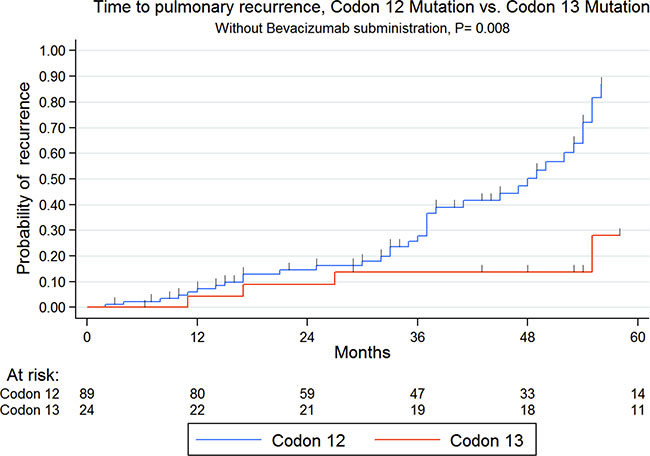 Figure 2: Kaplan-meier time to pulmonary recurrence according to codon 12 or 13 mutations in patients not treated with bevacizumab.