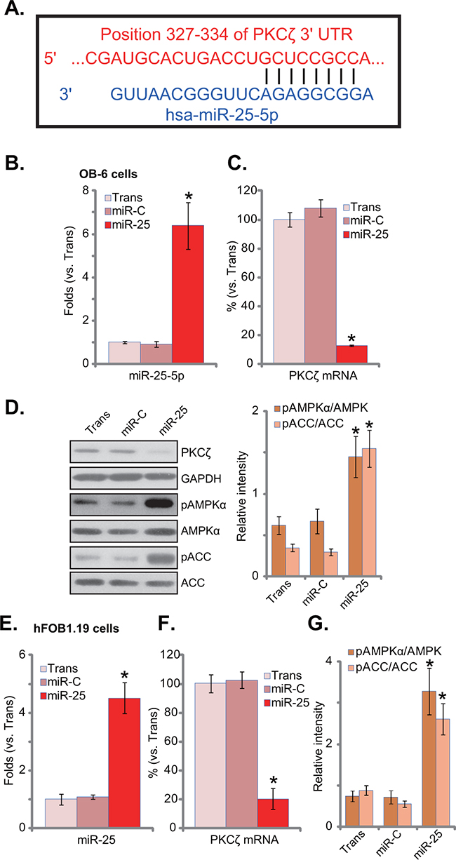 Figure 1: microRNA-25 downregulates PKCζ and activates AMPK signaling in human osteoblastic cells. A. microRNA-25-5p (“miR-25-5p”) targets the 3’ untranslated regions of human PKCζ. Human osteoblastic OB-6 cells B-D. or hFOB1.19 cells E-G. were transfected with has-pre-miR-25 or the control microRNA (“miR-C”), and stable cells were established; Expressions of miR-25-5p (B and E) and PKCζ mRNA (C and F) were tested by quantitative real-time PCR (“qRT-PCR”) assay; Expression of listed proteins in these cells was tested by Western blot assay, and phosphorylations of AMPKα and ACCα were quantified (D and G). Experiments in this figure were repeated three times, and similar results were always obtained. “Trans” stands for transfection reagents only (B-G). *p<0.05 vs. group “miR-C” (B-G).