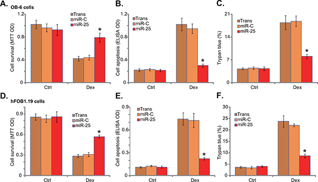 Figure 2: microRNA-25 protects human osteoblastic cells from Dex. Stable osteoblastic OB-6 cells A-C. or hFOB1.19 cells D-F. expressing microRNA-25 (“miR-25”) or control microRNA (“miR-C”) were treated with or without Dex (1 μM) for 24 hours, cell viability (MTT assay, A and D), cell apoptosis (Histone DNA ELISA assay, B and E) and cell death (trypan blue assay, C and F) were tested. Experiments in this figure were repeated three times, and similar results were obtained. “Ctrl” stands for untreated control group. “Trans” stands for transfection reagents only. *p<0.05 vs. “miR-C” cells with Dex treatment.