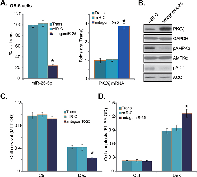 Figure 3: antagomiR-25 exacerbates Dex damages in human osteoblastic cells. Expressions of miR-25-5p (A, left), PKCζ mRNA (A, right), and listed proteins B. in stable osteoblastic OB-6 cells with antagomiR-25 or non-sense control microRNA (“miR-C”) were shown; Above cells were treated with or without Dex (1 μM) for 24 hours, cell viability (MTT assay, C.) and apoptosis (Histone DNA ELISA assay, D.) were tested. Experiments in this figure were repeated three times, and similar results were obtained. “Ctrl” stands for untreated control group. “Trans” stands for transfection reagents only. *p<0.05 vs. “miR-C” cells.