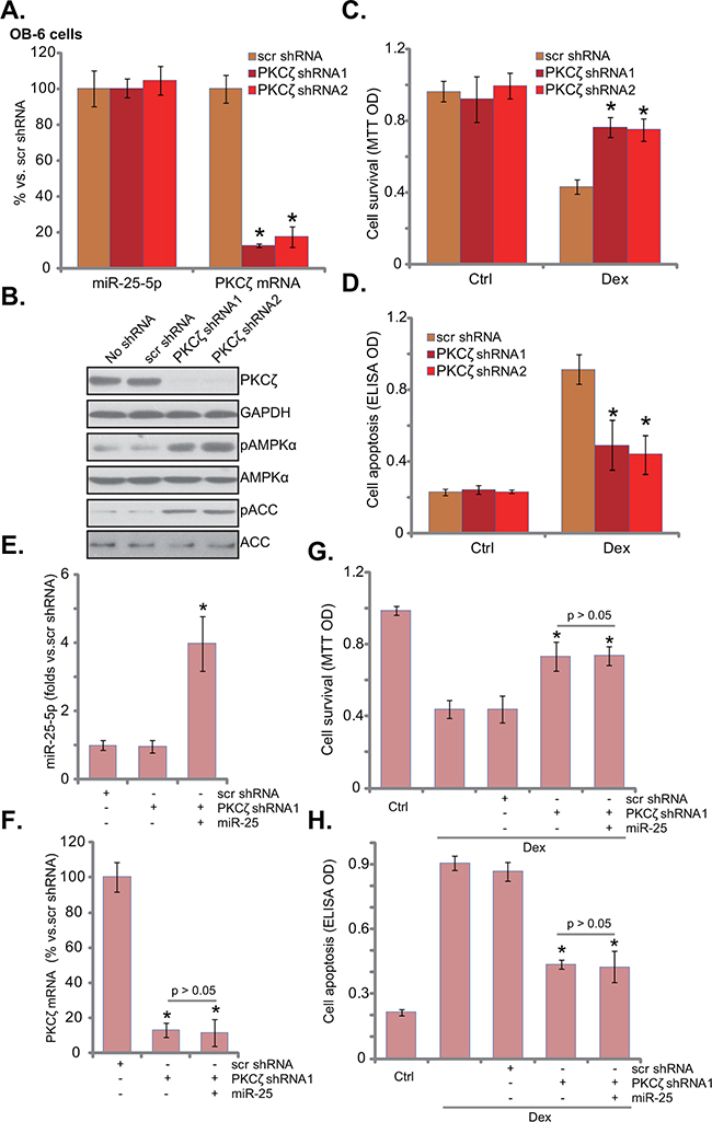 Figure 4: PKCζ knockdown activates AMPK and protects human osteoblastic cells from Dex. OB-6 cells were infected with lentiviral PKCζ shRNA (“-1 or -2”) or non-sense control shRNA (“scr shRNA”), and stable cells were established; miR-25-5p and PKCζ mRNA expression levels in these cells were tested A., PKCζ protein expression and AMPK activation were also tested B. Above cells were treated with or without Dex (1 μM) for 24 hours, cell viability (C, MTT assay) and apoptosis (D, Histone DNA ELISA assay) were shown. PKCζ shRNA (“-1”)-expressing OB-6 cells were transfected with miR-25, expressions of miR-25-5p E. and PKCζ mRNA F. were shown; These cells were also treated with or without Dex (1 μM) for 24 hours, cell viability G. and apoptosis H. were tested. “Ctrl” stands for untreated control group. Experiments in this figure were repeated three times, and similar results were obtained. *p<0.05 vs. “scr shRNA” cells (A, C-H).