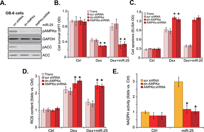 Figure 5: AMPK activation is required for miR-25-induced cytoprotection in osteoblastic cells. Stable OB-6 cells with miR-25 were constructed with dominant negative AMPKα (“dn-AMPKα”, T172A), AMPKα shRNA, or the scramble control shRNA (“scr shRNA”), expressions of listed proteins in these cells were tested by Western blots A. Above cells were treated with or without Dex (1 μM), cell viability (MTT assay, 24 hours, B., apoptosis intensity (Histone DNA ELISA assay, 24 hours, C. and ROS content (DCFH-DA fluorescent dye assay, 6 hours, D. were tested; NADPH activity in above cells was also shown (4 hours, E). Experiments in this figure were repeated three times, and similar results were obtained. “Ctrl” stands for untreated control group. *p<0.05 vs. “scr shRNA” cells.