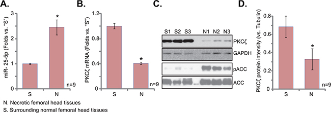 Figure 6: miR-25-5p upregulation correlates with PKCζ downregulation and AMPK activation in human osteonecrosis tissues. Expressions of miR-25-5p A. and PKCζ mRNA B. in surgery-isolated femoral head tissues (both normal or “S” and necrotic or “N”) from GC-taking patients (n=9) were tested by qRT-PCR assay; Expression of listed protein was tested by Western blots (C, and PKCζ expression was quantified in D). *p<0.05 vs. “S” tissues.