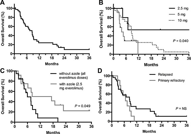 Three patients initially in the 2.5 mg cohort and 9 patients initially in the 10 mg cohort subsequently received azole antifungal prophylaxis from cycle 2 onwards, with the everolimus dose capped at 2.5 mg due to the higher drug levels expected from the interaction with CYP3A4 inhibitory azoles. A landmark analysis was performed on patients from cycle 2 day 1 (resulting in exclusion of 9 patients). Interestingly, ORR and OS were higher among patients who received everolimus and concurrent azoles, compared to those not receiving concurrent azoles: ORR 6/12 (50%) vs. 3/19 (16%, P = 0.056) and median OS 12.8 vs. 6.0 months (P = 0.049, Figure 1C), respectively.