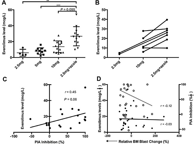 Figure 2: Everolimus pharmacokinetics and pharmacodynamics. (A) Blood everolimus trough levels according to dose cohort. ** denotes P < 0.01 and *** denotes P < 0.001, adjusted for Dunn’s multiple comparisons after a significant Kruskal-Wallis test. (B) Intra-patient changes in blood everolimus trough levels with the addition of azole and dose limited to 2.5 mg everolimus (data available for 7 patients). (C) Correlation of blood everolimus trough levels with Plasma Inhibitory Activity (PIA) for 19 patients. (D) Correlation of blood everolimus trough levels and PIA inhibition with the relative bone marrow blast reduction, respectively