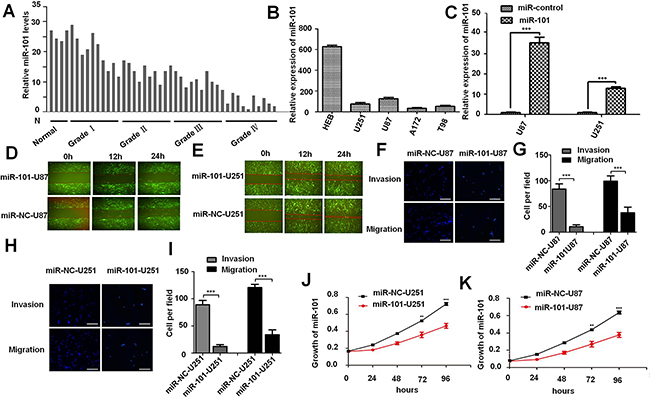 Figure 1: Overexpression of miR-101 inhibits glioma cell invasion, migration, and proliferation in vitro. A. miR-101 expression levels in normal brain tissue and glioma tumor tissues were detected by qRT-PCR analysis. B. The expression level of miR-101 in U87MG, U251MG, A172 and T98 glioma cells were detected by qRT-PCR analysis. C. The efficiency of lentivirus in U87MG and U251MG glioma cell lines were detected by qRT-PCR analysis. D. and E. Representative images of wound healing assay detecting cell migration in miR-101-U87MG, NC-U87MG, miR-101-U251MG and NC-U251MG cells. F. Cell invasion and migration of miR-101-U87MG and NC-U87MG cells were detected by trans-well assay. G. Quantitative analysis of the cell number of U87MG cell trans-well invasion and migration assay. H. Cell invasion and migration of miR-101-U251MG and NC-U251MG cells were detected by trans-well assay. I. Quantitative analysis of the cell number of U251MG cell trans-well invasion and migration assay. J. and K. Growth curves of miR-101-U251MG and NC-U251MG, miR-101-U87MG and NC-U87MG cell lines.