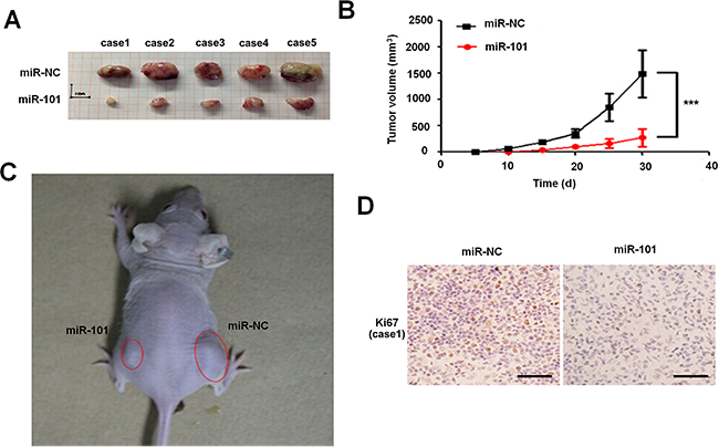 Figure 2: Overexpression of miR-101 suppresses the tumor growth in vivo. A. and B. Determination of the tumor growth, tumor volume was calculated every five days after injection (n = 5). ***p < 0.001. C. Representative image for tumor growth is shown. Nude mice were subcutaneously injected with 3.0×106 cells per flank miR-101 or miR-NC stable transfected U87MG cells. D. Immunohistochemistry assay detected the level of Ki67 in overexpression-miR-101 and miR-NC xenograft tumor tissues, 200 ×. Scale bar = 100 μm.