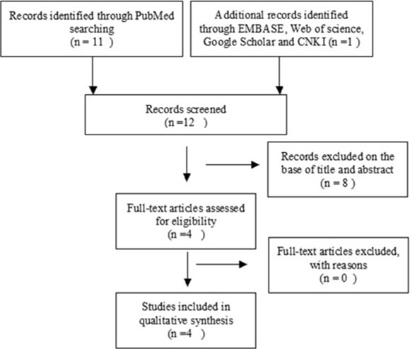 We performed a systematic electronic search in all available literature until July 2016 on PubMed, EMBASE, Web of Science and CNKI with no language limitations. We searched with the terms: “tumor or cancer or neoplasm or carcinoma” and “lung”, “methylation”, and “WIF-1 or Wnt inhibitory factor-1”. Additional studies were identified through manually searching key journals and screening reference list of included studies. There were 11 articles identified from PubMed and one article from CNKI. A total of 12 articles were screened by article titles and abstracts.