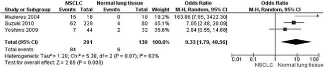 Figure 2: Forest plot for WIF-1 hypermethylation in NSCLC and non-neoplastic lung tissue. The squares represent the weight of individual study in the meta-analysis, the line width indicates the corresponding 95% CI, The diamond represents the pooled OR, and the width of diamond indicates 95% CI.
