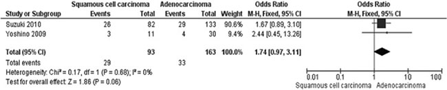 Figure 3: Forest plot for WIF-1 hypermethylation in AC and SCC. The squares represent the weight of individual study in the meta-analysis, the line width indicates the corresponding 95% CI, The diamond represents the pooled OR, and the width of diamond indicates 95% CI.