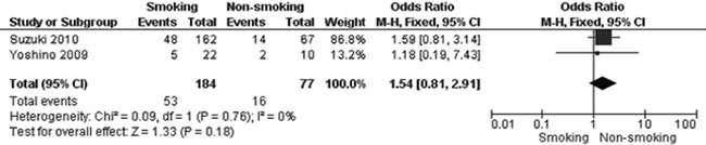 The results should be interpreted in view of certain limitations. First, only four studies were included in the meta-analysis, heterogeneity existed in some analysis which we used random effect model instead of fix effect model. Second, the included studies were retrospective and not randomized, however, most of them were of sufficiently quality (Newcastle-Ottawa Scale ≥ 7). Third, only studies in English and Chinese were included in the meta-analysis, eligible studies in other languages could be excluded. Fourth, smoker group was described as current and former smoker in one included study, [20] the finding could be confounded by former smoker. The result needs to be confirmed in more sensible way when more studies available.