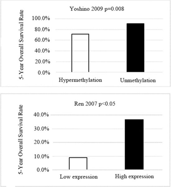 Figure 5: Charts for the association between WIF-1 expression or WIF-1 hypermethylation and 5-year survival rate.