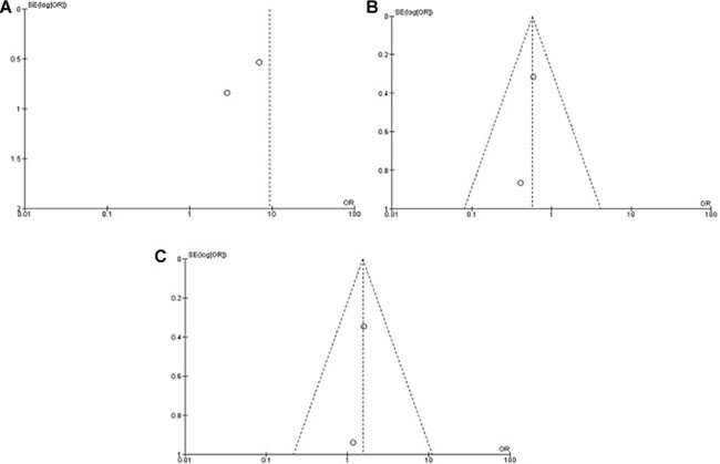 A sensitivity analysis was conducted by removing one study from the meta-analysis at a time; the overall results were not significantly affected. The pooled ORs were not significantly changed, indicating the stability of our analyses. The funnel plots were largely symmetrical (Figure 6A, 6B, 6C), suggesting there were no publication biases in the meta-analysis of WIF-1 methylation status between NSCLC and normal lung tissue, as well as WIF-1 methylation status between AC and SCC respectively.