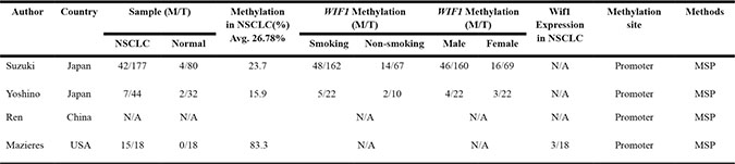 Abbreviations: NSCLC: Non-small cell lung cancer, M: Methylation, T: Total, N/A: Not available, MSP: Methylation-specific PCR
