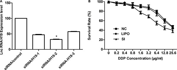 Figure 2: (A) qRT-PCR detection of H19 expression in A549/DDP cells after silencing of H19 by siRNA. The relative expression of H19 was 66.6% lower with si-H19-2 than with the negative control. (B) A549 sensitivity to cisplatin was detected by CCK-8 (Cell Counting Kit-8). Cells were exposed to various doses of cisplatin for 48 h. Inhibiting the H19 gene resulted in an approximately 47.12% decrease in the cisplatin IC50 in A549/DDP cells (IC50 in si-H19-2 and A549/DDP cells, 8.13 and 24.1 μg/mL, respectively).