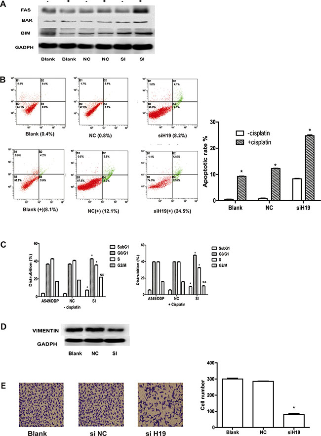 Figure 3: (A) Western blot analysis: FAS, BAK, and BIM (Bcl-2 interacting mediator of cell death). “+” indicates apoptosis markers detected with cisplatin, “−” indicates apoptosis detected without cisplatin. (B) Cisplatin-induced apoptosis in A549/DDP cells was demonstrated by flow cytometric analysis. Cells were treated with cisplatin for 48 h and then analyzed for early apoptotic cells (bottom right quadrant) and late apoptotic cells (top right quadrant). The percentage of cells in the two quadrants are shown. “+” stands for cisplatin-induced apoptosis in A549/DDP cells, "−" stands for apoptosis in A549/DDP cells without cisplatin. (C) Flow cytometry analysis of cell cycle distribution in si-H19-2-treated A549/DDP cells combined with various concentrations of cisplatin (0, 1.0 or 2.0) si-NC-treated and non-treated A549/DDP cells. NS indicates P > 0.05 and *indicates P < 0.05; respectively. (D) Western blot analysis of the proteins of epithelial-mesenchymal transition (EMT) in si-H19-2 treated and negative control (NC)-treated A549/DDP cells and non-treated A549/DDP cells. (E) Representative images of migratory cells on the membrane (magnification,100×).