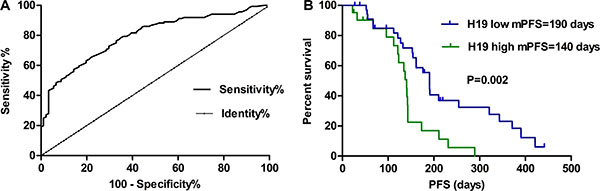 Figure 4: (A) Using a cut-off value 1.178 ng/mL, ROC analysis revealed an area under the curve (AUC) of 0.751 (P < 0.01), indicating a diagnostic sensitivity of 72.79% and specificity of 70.33% to differentiate high or low H19 expression levels from NSCLC patients. (B) Survival curves were analyzed by log-rank test and Kaplan-Meier method. Patients with low H19 levels had a dramatically longer survival than those with high H19 levels (P = 0.002).