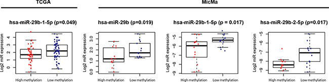 Expression levels of miRNAs from the miR-29 familiy and mRNA from the DNMTs were available for the MicMa cohort [40] (GEO accession number GSE19536) and the TCGA cohort [12]. As described earlier (Supplementary Table 1), samples from the MicMa cohort were split between two study cohorts due to platform differences when comparing DNA methylation. When comparing expression levels, all MicMa samples were treated as one cohort.