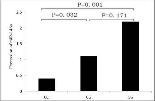 Figure 1: Sequence variations in the miR-146a can influence its expression. The relative expression (2-△△Ct) of miR-146a to U6 was significantly different between the CC genotype and the CG or GG genotype.