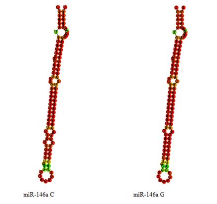 The change of the miRNA secondary structure caused by SNP or mutation has been hypothesized to influence the maturation process of miRNA We found that the G to C SNP of miR-146a rs2910164 caused a structure disturbance in the stem region of the miR-146a and leads to the increased production of mature miR-146a. Similar results have also been found for other miRNA genes. The SNPs of miR-125a and miR-30 could introduce base-pairing mismatches, alter free energy values, and create large bulges in the predicted secondary structure, which are detrimental to the production of miRNAs [12].