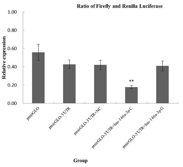 To evaluate the influence of the rs2910164 variant on the binding of miR-146a-3p to TRAF6 mRNA, we generated TRAF6 3′UTR luciferase reporter plasmids that were cotransfected with chemically synthesized mature miR-146a-3p miRNAs (C or G allele) in A549 cell lines. As shown in Figure 3, we observed significantly lower levels of luciferase expression when we cotransfected TRAF6 3′UTR luciferase reporter plasmids with chemically synthesized mature miR-146a-3p miRNA carrying the rs2910164 C allele (0.177 ± 0.018 for C versus 0.409 ± 0.054 for G, P = 0.001). The results suggested that miR-146a-3p wild-type might be able to specifically combined to TRAF6 3′UTR and significantly inhibit the translation of TRAF6 gene.
