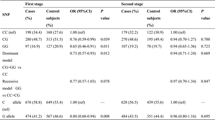 The present study includes 1131 cases and 1003 control subjects, among which are 575 cases and 608 control subjects whose results have been reported [14]. Therefore, the case-control study results in the present study are defined as first-stage (published results) and second-stage (new added results) (Table 1). All individuals were nonsmoking females. The mean ages were 56.94 ± 11.72 years and 56.27 ± 12.56 years in the case group and the control group, respectively. There were no differences in ages between cases and control subjects (P = 0.200). Among lung cancer cases, 761 patients had adenocarcinoma, 197 had squamous cell carcinoma, and 166 had other types of cancer. The genotype distributions of miR-146a rs2910164 SNP in the cases and control subjects are shown in Table 2. The observed genotype frequencies agree with those expected under the Hardy-Weinberg equilibrium in the control subjects (P = 0.521).