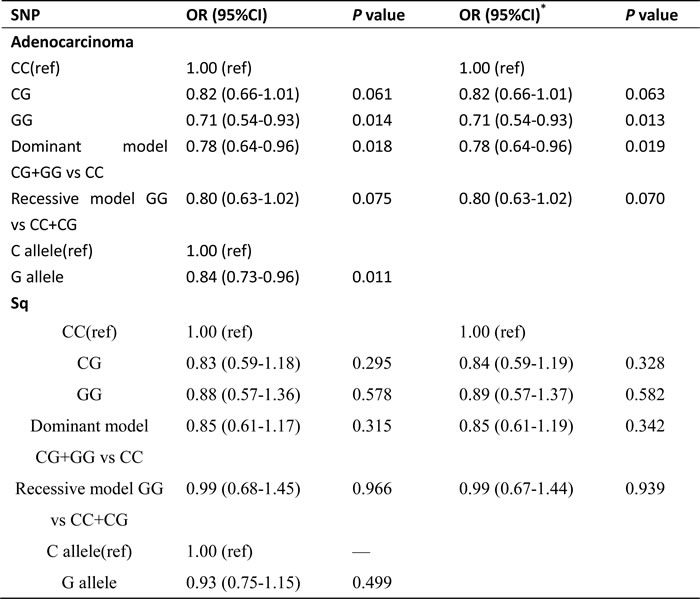 Table 3: The association of miR-146a polymorphism and lung cancer risk by cancer type