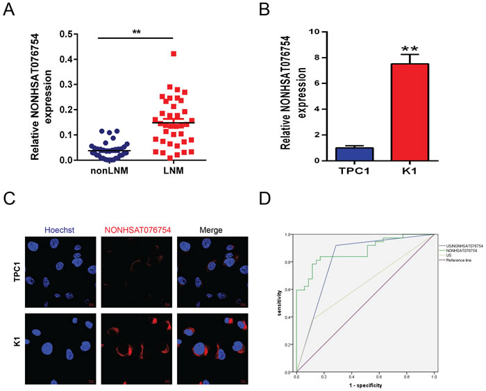 Figure 1: LncRNA NONHSAT076754 is overexpressed in PTC with LNM. The expression level of NONHSAT076754 was detected in PTC tissues (nonLNM (n = 35) and LNM (n = 37)) A. and cell lines B. by qRT-PCR. The value was normalized to GAPDH mRNA expression. “**” indicates P < 0.05. C. FISH analysis of the subcellular distribution of NONHSAT076754 in TPC1 and K1 cells as detected by confocal microscopy. Nuclei (blue) were labeled with Hoechst solution; the NONHSAT076754 probe (red) was labeled with Cy3. Representative images of three repeated experiments are shown. The scale bar is 10 μm. D. The ROC curves of ultrasonography and NONHSAT076754 predicted potential diagnostic values of ultrasonography and NONHSAT076754. NONHSAT076754: AUC 0.878 (0.798, 0.958), P﹤0.01; US/NONHSAT076754: AUC 0.817 (0.712, 0.921), P﹤0.01.