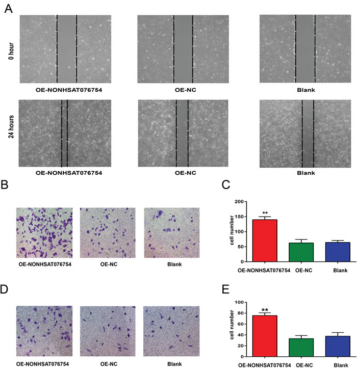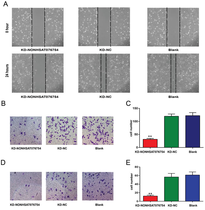 Figure 2: Effect of NONHSAT076754 on the migration and invasiveness of TPC1 cells. A. A scratch test was performed to determine the migration ability of TPC1 cells. Representative images at 0 and 24 hours from three repeated experiments are shown. B. A Transwell assay was performed to determine the migration ability of TPC1 cells. Representative images show invasive cells in the lower chamber stained with crystal violet. C. The quantification of cell migration is presented as the number of migrating cells. Data are expressed as the means±SD of three independent experiments. D. A Transwell assay was performed to determine the invasion ability of TPC1 cells. Representative images show invasive cells in the lower chamber stained with crystal violet. E. The quantification of cell invasion is presented as number of migrating cells. Data are expressed as the means±SD of three independent experiments. “**” indicates P < 0.01.
