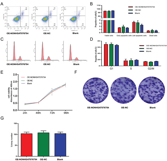 Figure 4: Effect of NONHSAT076754 on the proliferation and cell cycle status of TPC1 cells. A. Images from the flow cytometric analysis of apoptosis in TPC1 cells. B. The percentage of apoptotic cells is presented in the histogram. Data are expressed as the means±SD of three independent experiments. C. Images from the flow cytometric analysis of the cell cycle in TPC1 cells. D. Results quantified in the cell cycle analysis are shown as a percentage of the total number of cells. Data are expressed as the means±SD of three independent experiments. E. A CCK-8 assay was performed to determine the proliferation of TPC1 cells transfected with NONHSAT076754 after 24 hours, 48 hours, 72 hours and 96 hours. F. A colony formation assay was performed to determine the proliferation of TPC1 cells transfected with NONHSAT076754. The colonies were captured and counted. G. The colony formation assay results are presented in the histogram. All experiments were performed independently in triplicate, and the results are presented as the means±SD.