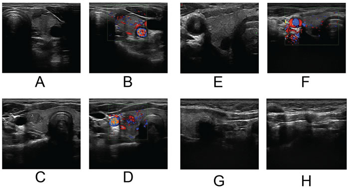 Figure 5: A.&B. A hypoechoic tumor on the left lobe with an irregular margin and 25~50% capsular abutment. Color-Doppler showed central vascularity with medium blood flow. LNM in the left central compartment was detected by ultrasonography while pathology showed no cervical LNM. C.&D. An isoechoic tumor on the right lobe with an irregular margin and microcalcification. Color-Doppler showed mixed vascularity with high blood flow. LNM in both left and right central compartment was detected by ultrasonography while LNM only on the right side was confirmed by pathology. E.&F. A markedly hypoechoic tumor on the right lobe with an irregular margin and low blood flow. No suspected LNM was detected by ultrasonography while LNM in the right central compartment were diagnosed by pathology. G.&H. A hypoechoic tumor on the right lobe with an irregular margin. LNM in the right central compartment was detected by ultrasonography while pathology confirmed LNM in both the left and right central compartments.