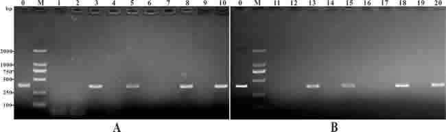 Figure 3: PCR detection of plasmid DNA in muscle of the vaccinated fish. Channel fish were treated with PBS (lane 1, 6, 11, 16), or vaccinated with pcDNA3.1 (lane 2, 7, 12, 17), pcIL-8 (lane 3, 8, 13, 18), pcENO (lane 4, 9, 14, 19) and pcENO+pcIL-8 (lanes 5, 10, 15, 20) respectively. Muscle samples were taken and used for DNA extraction from the vaccinated fish at 7 days (lanes 1-5), 14 days (lanes 6-10), 28 days (lanes 11-15) and 56 days (lanes 16-20) p.v. respectively. Lane 0 (positive control): PCR product of plasmid pcIL-8, lane M: DNA markers (DL2000).