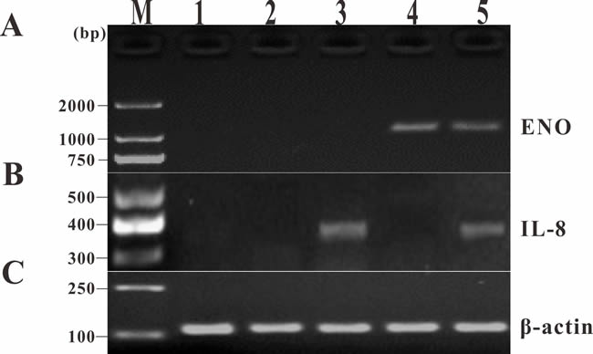 Figure 4: RT-PCR analysis of transcription of ENO gene and exogenous IL-8 gene in muscle tissues of the vaccinated fish at 14 days p.v. A. ENO gene. B. Exogenous IL-8 gene. C. β-actin gene. M: DNA marker; lane 1~5, muscle injected with PBS, pcDNA3.1, pcIL-8, pcENO and pcENO+pcIL-8, respectively.