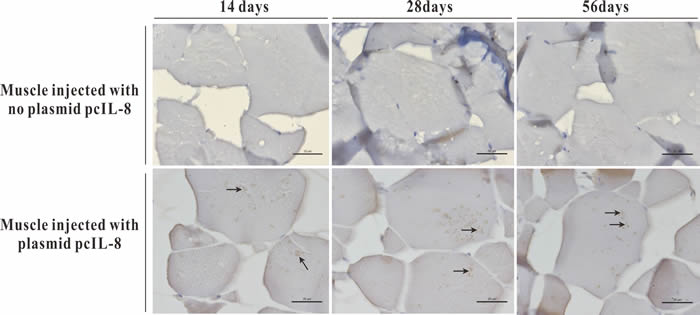 Figure 5: Immunohistochemistry analysis of exogenous IL-8 expressed in muscle tissues of the vaccinated fish at 14, 28 and 56 days p.v. Bar = 20 μm.
