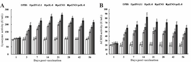 Figure 6: Serum lysozyme activity A. and ACH50 activity B. of vaccinated fish. Sera were collected at different time points p.v. from the fish vaccinated with PBS (control), pcDNA3.1, pcIL-8, pcENO and pcENO+pcIL-8. Data are presented as means ± SD (n = 5). Differences analysis between groups were determined using one-way ANOVA and Duncan’s test. Different letters mean that the data of different groups in the same time differ significantly (p < 0.05). The same as below.