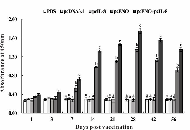 Figure 7: Specific serum antibody detection in vaccinated fish by ELISA. Sera were collected at different days p.v. from the fish vaccinated with PBS (control), pcDNA3.1, pcIL-8, pcENO and pcENO+pcIL-8. Data are presented as means ± SD (n = 5). Different letters mean that the data of different groups in the same time differ significantly (p < 0.05).