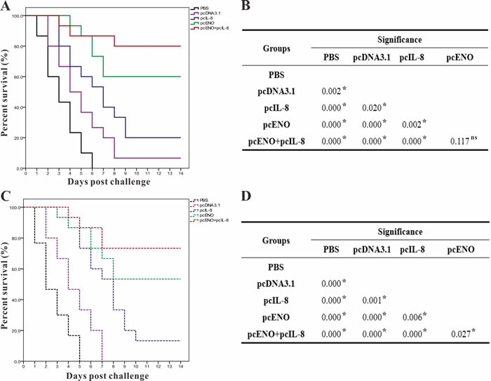 Figure 9: Percent survivals (Kaplan-Meier) of vaccinated fish (n = 30) during the challenges tests of 4 week p.v. A. and 8 week p.v. C.. Differences of survivals among groups were tested using log-rank test shown in B (4 week p.v.) and D (8 week p.v.). The experiments were repeated twice independently with similar results. “*” denotes significant difference (p < 0.05), “ns” means not significant.