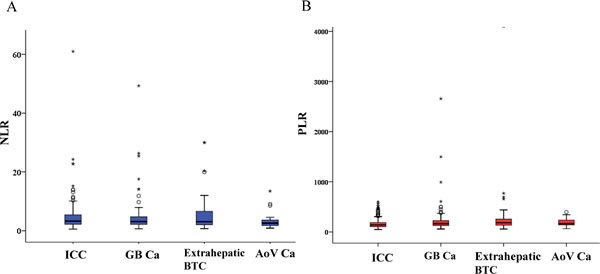 Figure 1: Distribution of NLR,PLR in each subtype of biliary tract cancers. A. Distribution of NLR in each subtype of biliary tract cancers. B. Distribution of PLR in each subtype of biliary tract cancers.