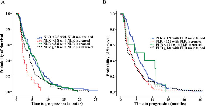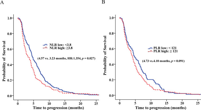 Figure 4: The progression free survival according to NLR and PLR. A. The progression free survival according to NLR. B. The progression free survival according to PLR