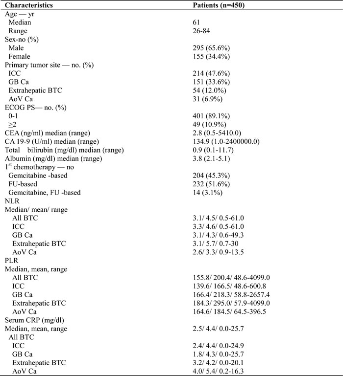 A total of 450 patients with unresectable BTC were enrolled. Patient characteristics are shown in Table 1. The median age was 61 years (range, 26-84 years). The study cohort consisted of 295 (65.6%) males and 155 (34.4%) females. Malignancies included 214 (47.6%) intrahepatic cholangiocarcinomas (ICC), 151 (33.6%) gallbladder cancers (GB Ca), 54 (12.0%) extrahepatic bile duct cancers (Extrahepatic BTC), and 31 (6.9%) Ampulla of Vater cancers (AoV Ca). The Eastern Cooperative Oncology Group (ECOG) Performance Status (PS) was either 0 or 1 in 401(89.1 %) patients, and PS was 2 in 49 (10.9%) patients. The laboratory values at the time point of advanced BTC diagnosis were as follows: median CEA level, 2.8 ng/mL (range, 0.5-5410.0 ng/mL); cancer antigen 19-9(CA 19-9) value, 134.9 U/mL (range, 1.0-240,0000 U/mL); median total bilirubin, 0.9 mg/dL (range, 0.1-11.7,mg/dL); and albumin, 3.8 g/dL (range, 2.1-5.1 g/dL). The median value of NLR was 3.1 (range, 0.5-61.0), and the median value of PLR was 155.8 (range,48.6-4099.0). In terms of tumor origin, the median NLRs were 3.3, 3.1, 3.1, and 2.6 in ICC, GB Ca, Extrahepatic BTC, and AoV Ca, respectively. The median PLRs were 139.6, 166.4, 184.3, and 164.6 in ICC, GB Ca, Extrahapatic BTC, and AoV Ca, respectively (Figure 1). 204 patients (45.3%) received gemcitabine-based chemotherapy as a first-line treatment, and 232 patients (51.6 %) received fluoropyrimidine-based chemotherapy as first-line treatment.