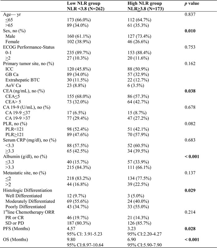 The patients with elevated CEA, low albumin and histologic poorly differentiation were more frequently found in the high NLR group (p = 0.038, p < 0.001, p = 0.029, respectively) (Table 2). In contrast, primary tumor site, the response rate, CRP were not different between high and low NLR groups (p =0.162, p =0.214, p = 0.683). Patients with high NLR showed worse PFS and OS compared with patients with low NLR (3.23 months vs 4.57 months, p = 0.028; 6.90 months vs 9.80 months, p < 0.001).