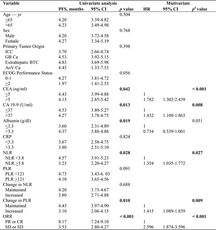 Abbreviations: ICC, intrahepatic cholangiocarcinoma; BTC, biliary tract cancer; GB Ca, gallbladder cancer;AoV Ca, ampulla of Vater cancer; ECOG PS, Eastern Cooperative Oncology Group performance status;CEA, carcinoembryonic antigen; CA 19-9, cancer antigen 19-9; NLR, neutrophil-lymphocyte ratio; PLR, platelet-lymphocyte ratio; CRP, C-reactive protein; ORR , objective response rate; PR, partial response; CR, complete response; SD, stable disease; PD, progression disease; OS, overall survival; PFS, progression- free survival; 95% CI, 95% confidence interval
